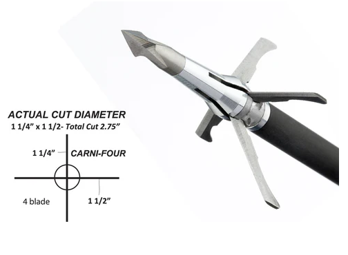 CARNI-FOUR 4-BLADE - 4-blade, 1 ½” x 1 ¼” mechanical with Staggered Blade Technology that will change the mechanical world forever! The instant the two longer 1 ½” cut blades make contact and compress the internal spring, the two shorter 1 ¼” cut blades release and open with the touch of a hair! Giving you the largest 4-blade entrance hole on the market and an incredible “square” wound channel from start to finish!