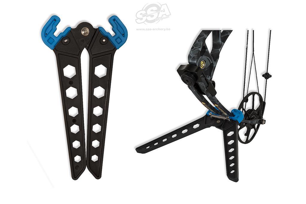Universal fit kickstand for bows with parallel and beyond parallel limbs. Rubber overmold protects the limb while providing better grip to the bow.