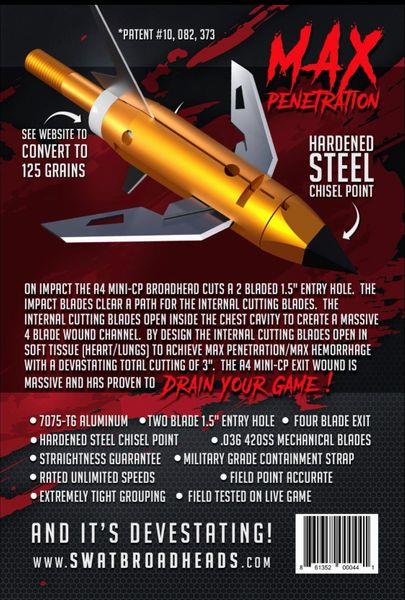 The Model A4 Mini CP is the most advanced mechanical broadhead on the market. On impact the A4 Mini cuts a devastating hole of 1.5 inches which opens the hide and allows easy penetration of the secondary internal cutting blades. At the entry of the rib cage the secondary 1.5" cutting blades open which changes the shape of the two blade entry to an extremely massive wound channel through the vital organs. As the A4 leaves the animal it exits with a 4 blade exit wound that can only be described as maximum carnage. Penetration and extreme hemorrhage is achieved with the HARDENED STEEL CHISEL POINT TESTED ON STEEL PLATE. The frame is constructed of 7075-T6 Aluminum 1.5 times stronger than 6061. The extra strength of the 7075-T6 frame maximizes durability for multiple kills. All mechanical blades are constructed of 420 Stainless Steel and hardened for extreme use. RATED UNLIMITED SPEEDS!
