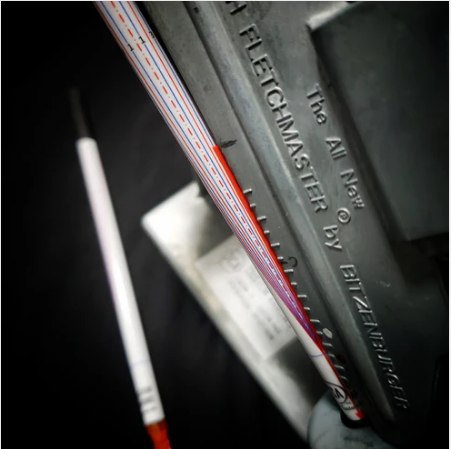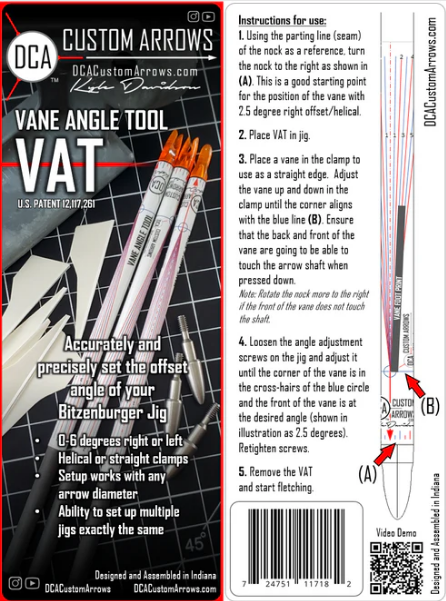 Use this patented tool to precisely set up your Bitzenburger fletching jig to the desired helical (or offset) angle. The wrap shows angles from 0 - 6 degrees left or right and is attached to a 7” section of 0.204 ID arrow and includes a nock. Just place an arrow in the clamp, turn the nock so that the bottom corner of the vane is in the crosshair as shown and adjust the dials on the jig. This works with the straight and helical clamp. The helical clamp actually puts the vane on straight, it just follows the curvature of the arrow better. Simple, precise, and highly effective.